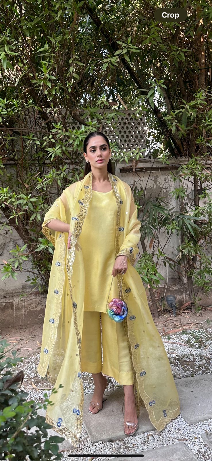 A radiant yellow outfit crafted with a sleek silk kurta and tailored pants, paired with a pure organza dupatta embellished with intricate embroidery, gotta work and blue accents. This ensemble exudes a fresh, vibrant charm, perfect for daytime festivities or intimate celebrations.