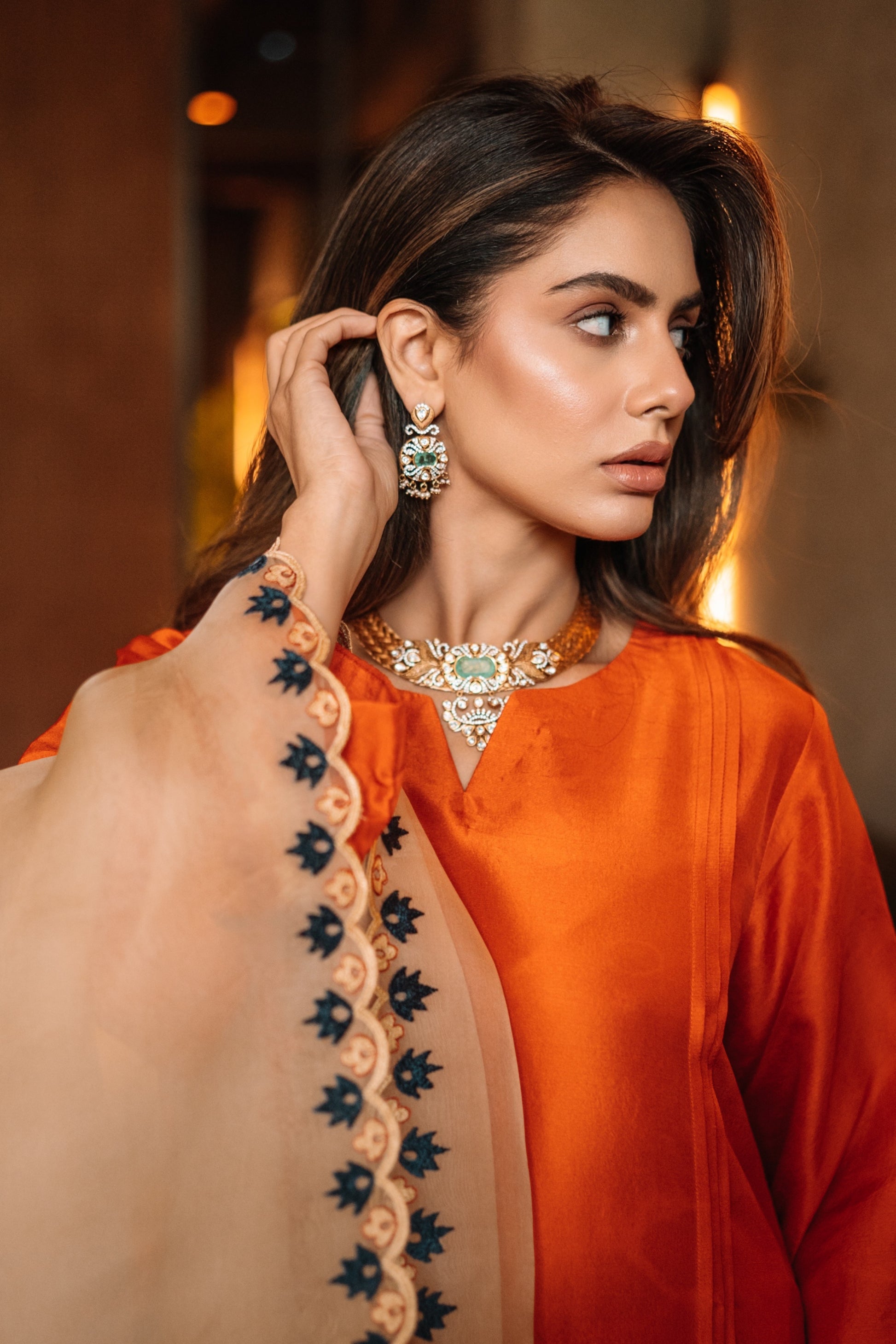 A portrait of radiance-this luminous saffron silhouette, framed with a delicately embroidered ivory drape, redefines festive sophistication. Crafted for the woman who carries tradition with an unshakable confidence, it is both a statement and a story.