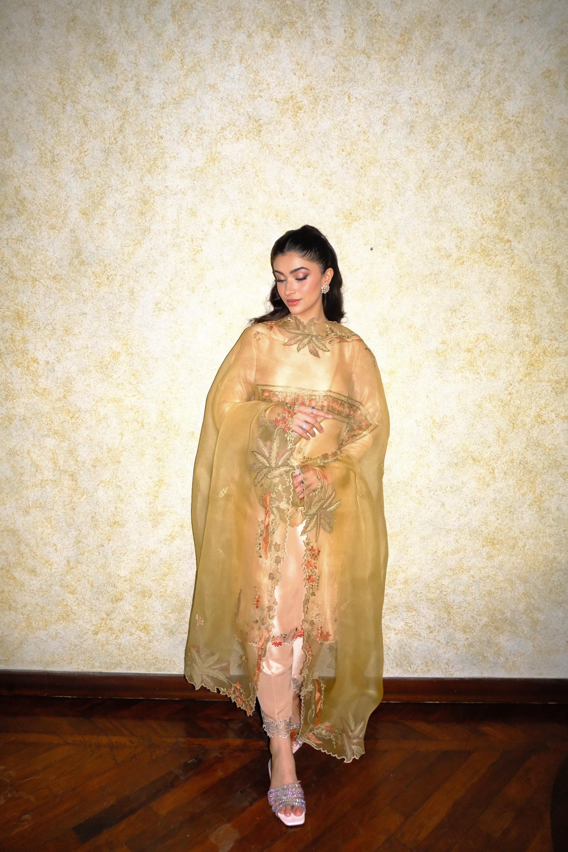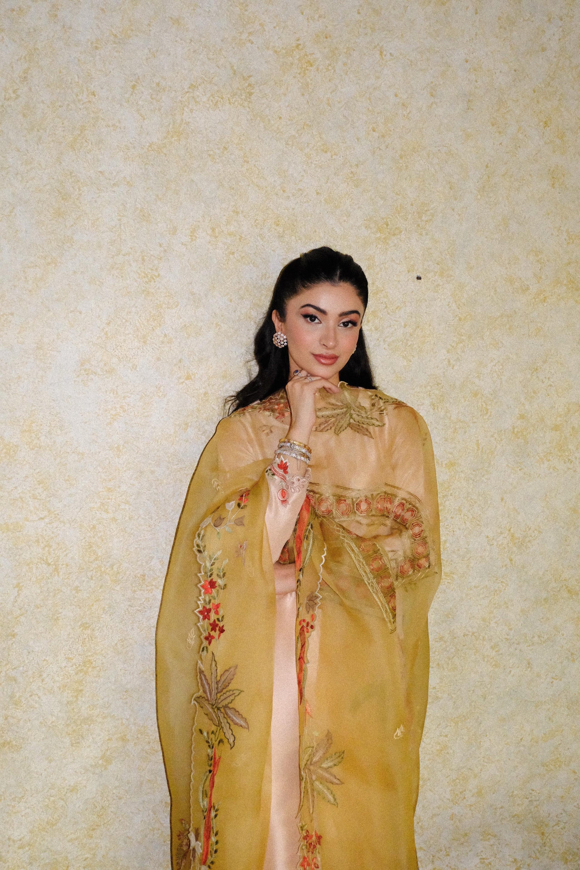 A graceful ensemble crafted in pure raw silk, this set radiates timeless elegance and luxury. Paired with a pure organza dupatta in a rich mustard hue, the contrast creates a vibrant, festive harmony. The natural sheen of raw silk adds subtle sophistication, while the light, airy organza completes the look with effortless charm.