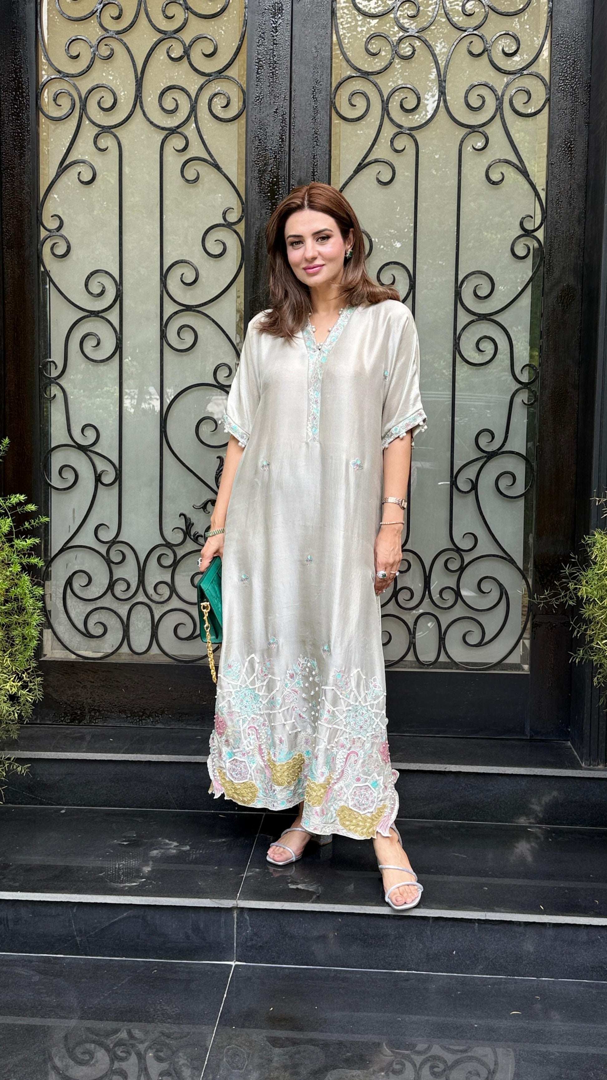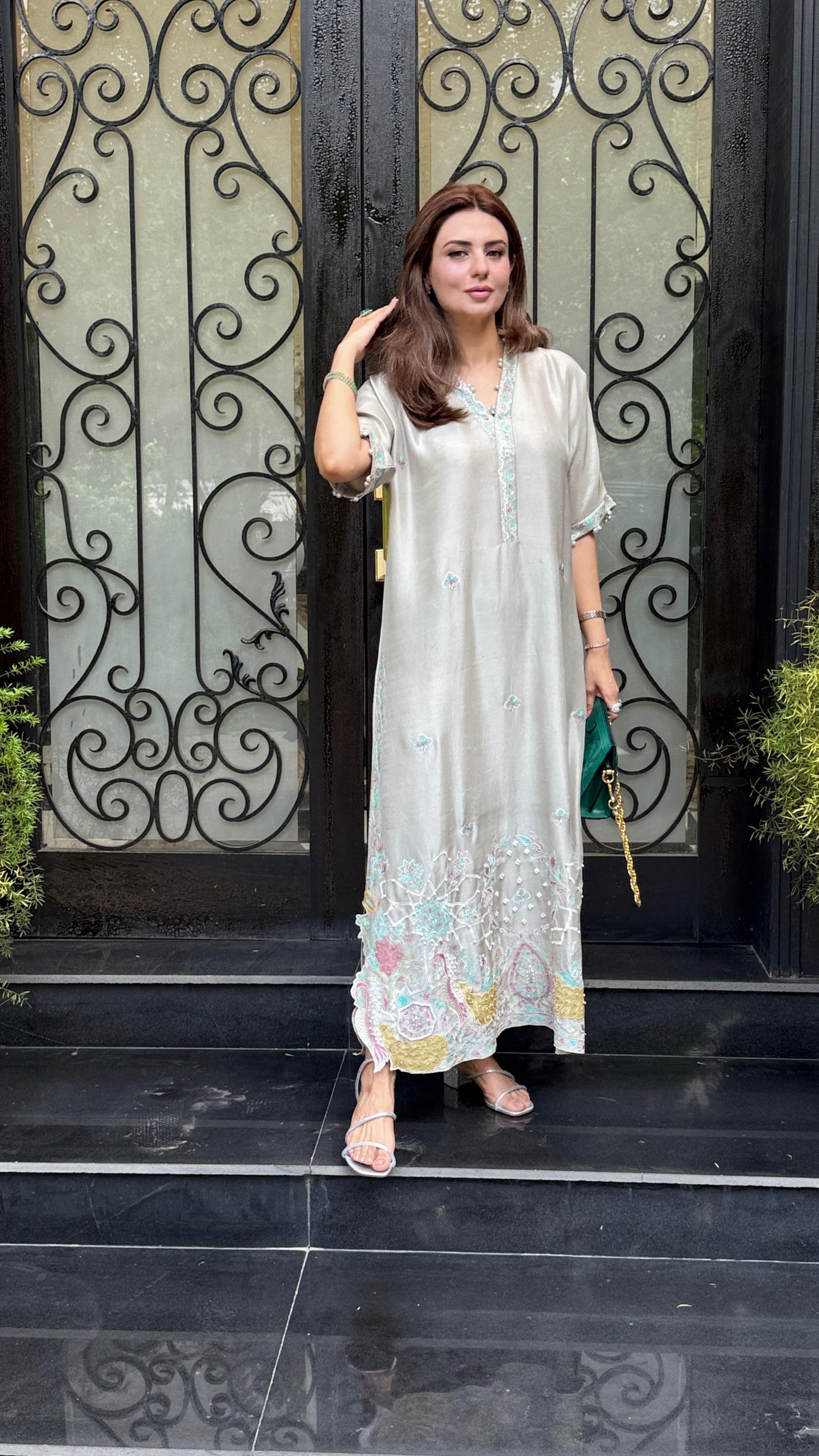 Our raw silk pale grey kaftan is a captivating blend of the embroidery with refined elegance. Adorned with embroidery in pastel hues - It is further enhanced with applique work, adding a dreamy aspect to its design.